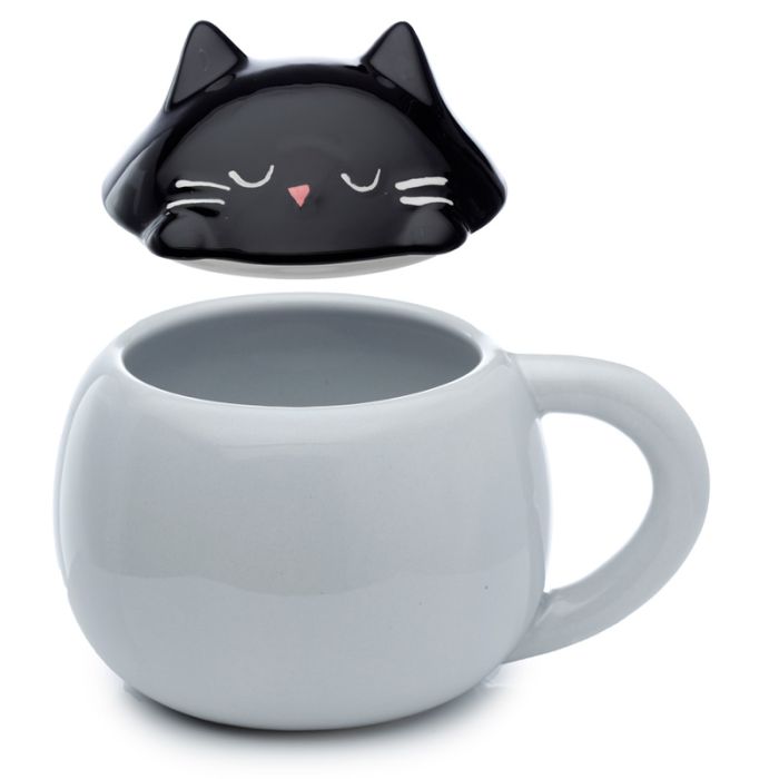 Deze bolvormige witte mok met een unieke speelse kattenkop deksel, brengt plezier in elke slok.