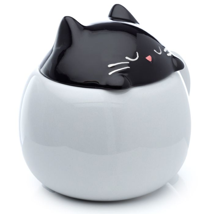 Kleur deksel: Zwart met witte oogjes en snorharen.
