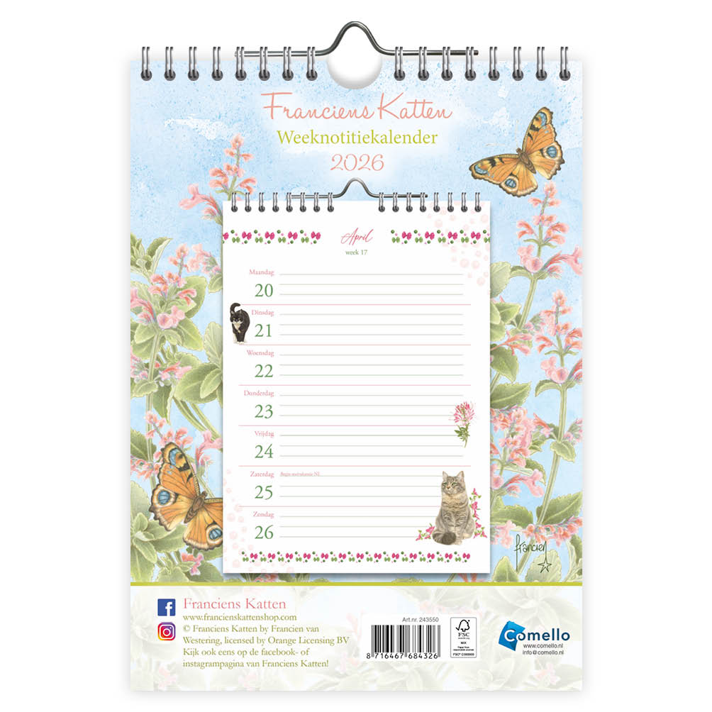 Deze handige kalender combineert Franciens prachtige kattenillustraties met voldoende ruimte voor al je wekelijkse notities.