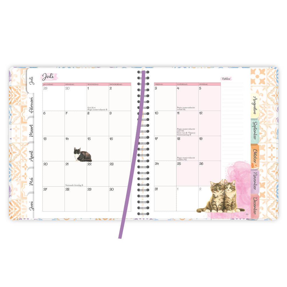 De planner bevat alle Nederlandse en Belgische feestdagen en vakanties en iedere maand begint met een handig tabblad.
