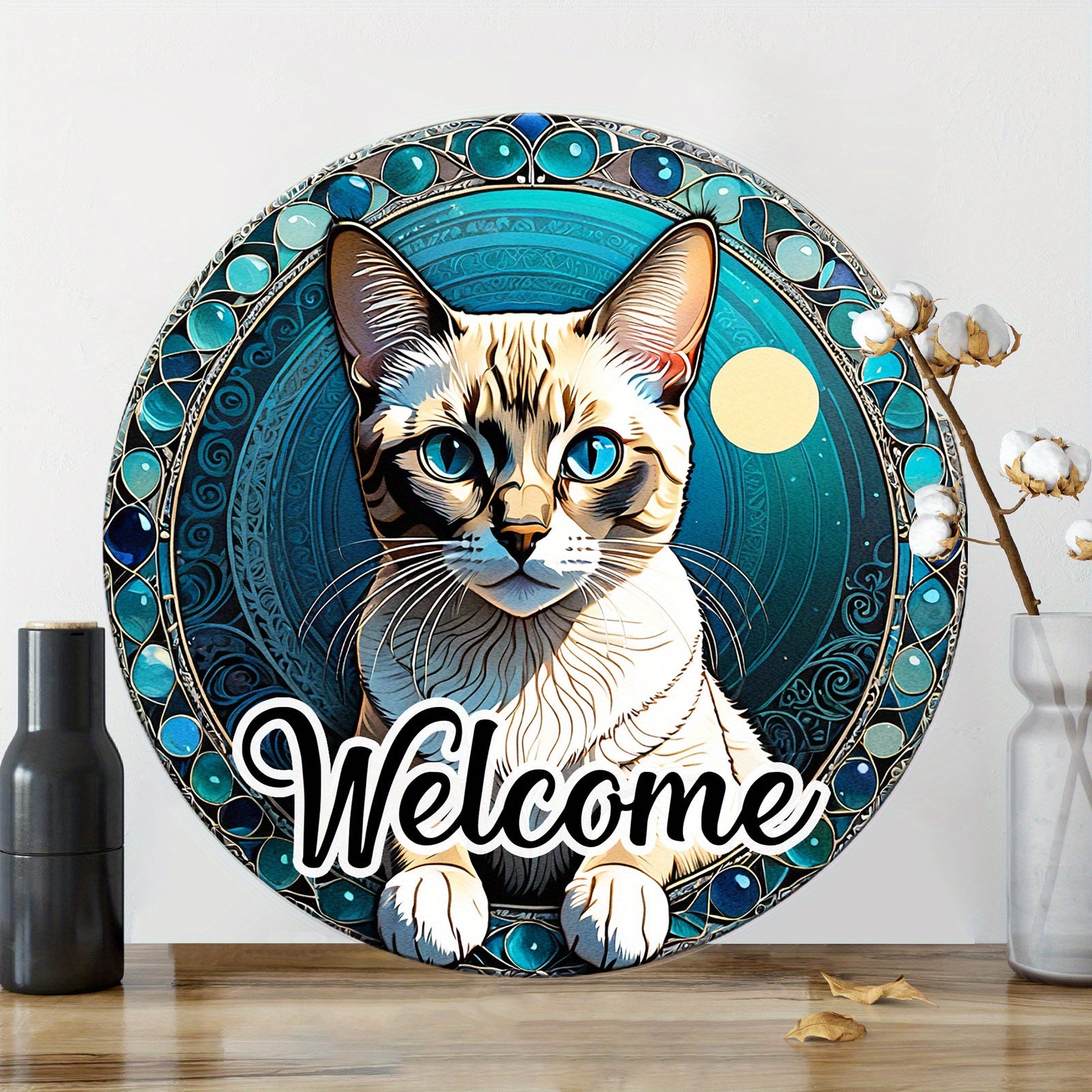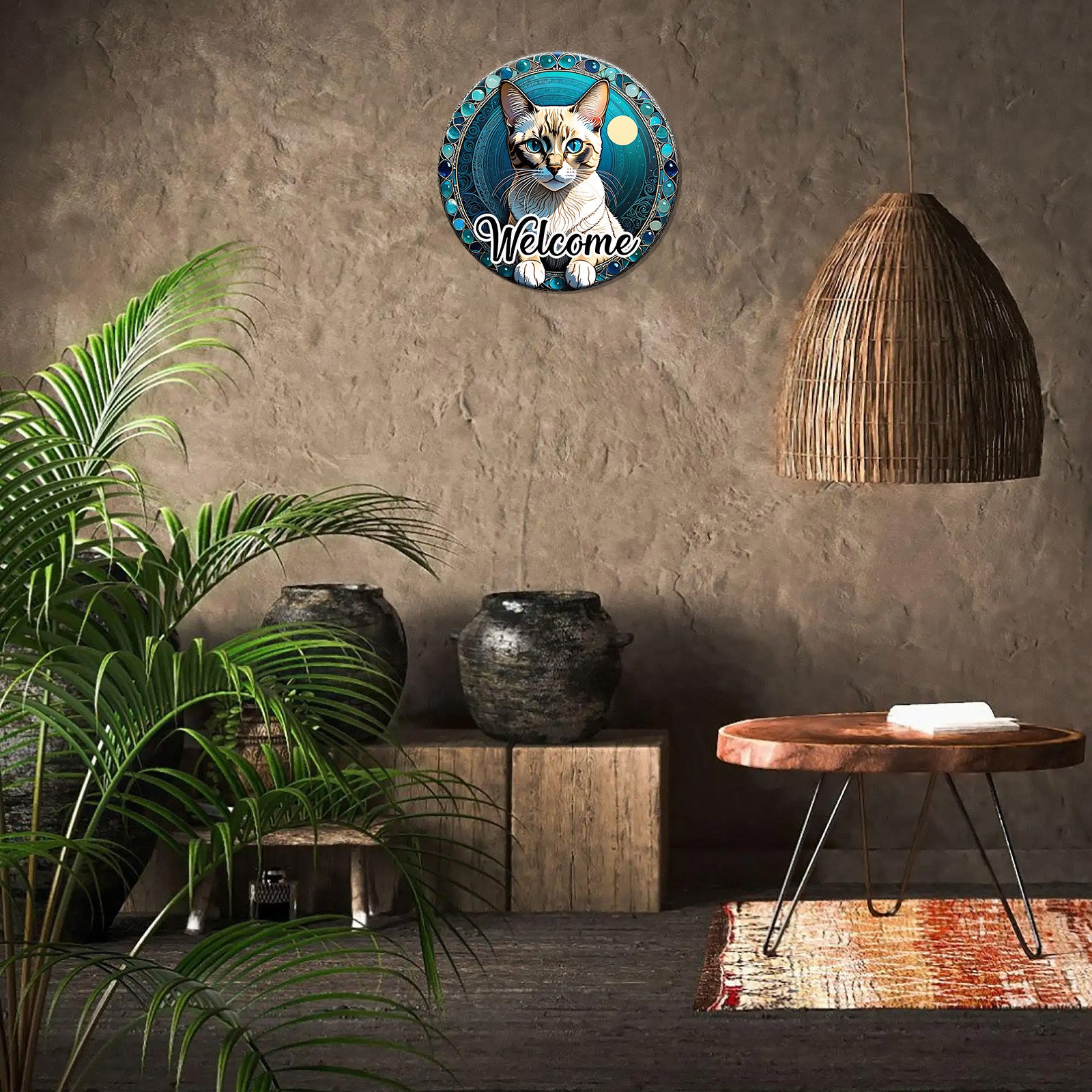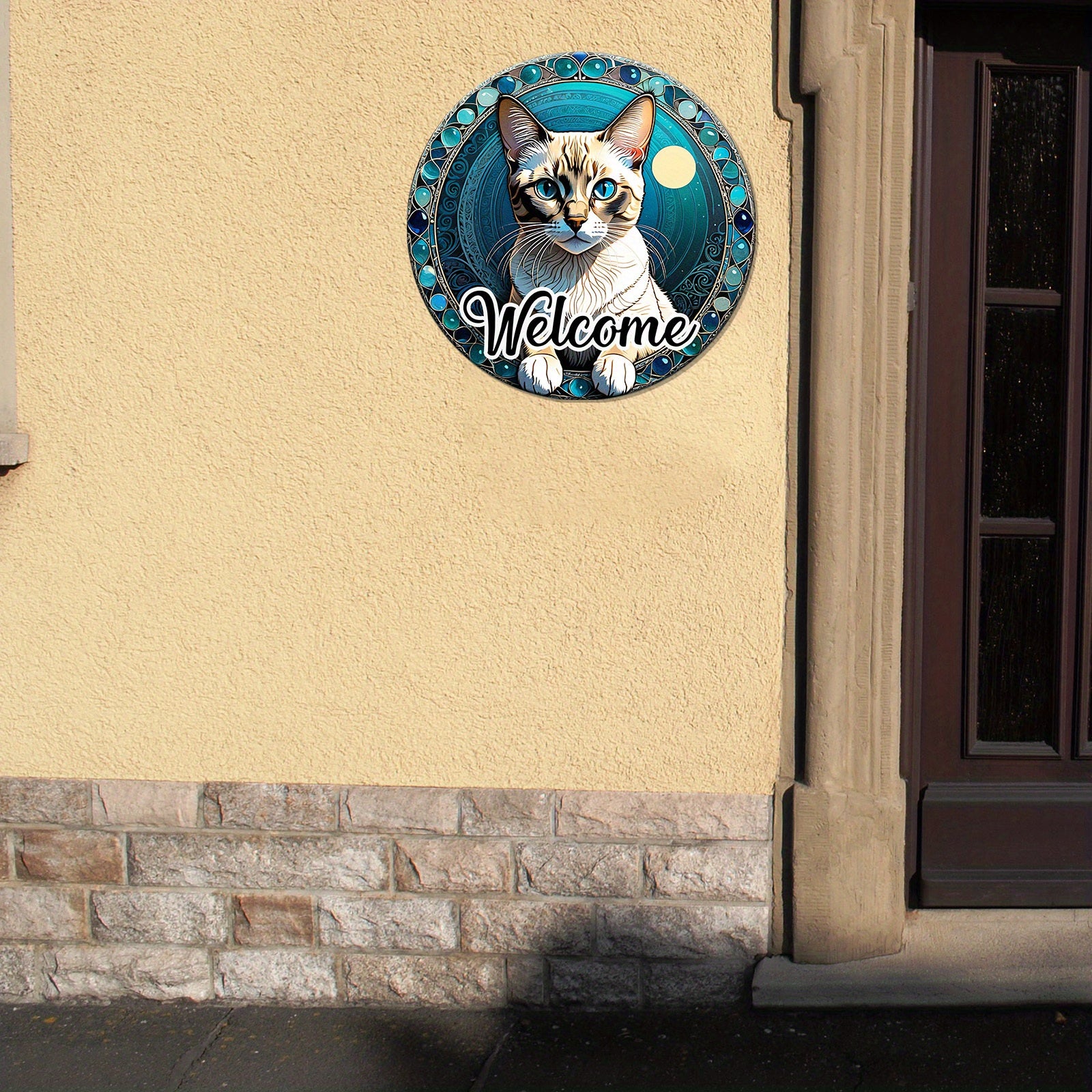 Dit sierlijke blauwe wandbord, met een diameter van 20 cm, is vervaardigd uit hoogwaardig aluminium en toont een elegante Siamese kat met de vriendelijke boodschap "Welcome".